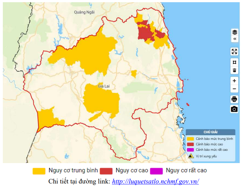 Cảnh báo nguy cơ: Trong 06 giờ tới, nguy cơ cao xảy ra lũ quét trên các sông, suối nhỏ vùng núi; sạt lở đất trên sườn dốc, sụt lún đất tại các xã, phường trong tỉnh Gia Lai (Phụ lục 1).