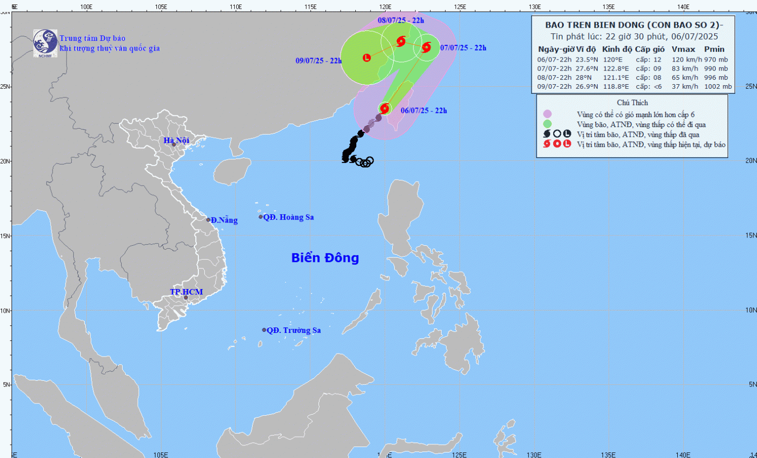 Đêm 06/7, vùng biển phía Đông Bắc khu vực Bắc Biển Đông còn có gió mạnh cấp 6-8, sóng biển cao 3,0-5,0m, biển động mạnh. Từ ngày 07/7, gió mạnh giảm dần.