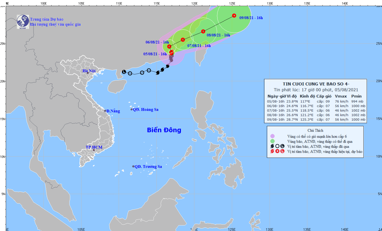 Bão số 4 đã di chuyển ra ngoài và không còn khả năng quay trở lại Biển Đông. Đây là tin cuối cùng về bão số 4. Tình hình mưa dông, gió mạnh và sóng lớn trên biển còn khả năng kéo dài, đề nghị theo dõi cảnh báo mưa dông, gió mạnh và sóng lớn trên biển trong các bản tin tiếp theo.