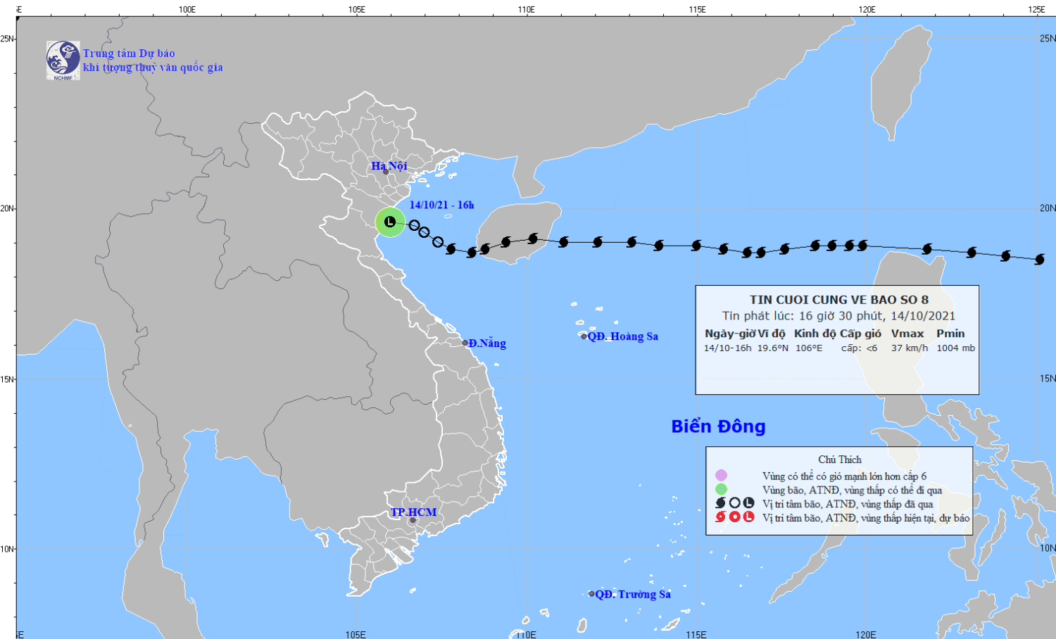 Hồi 16 giờ, vị trí tâm vùng áp thấp ở vào khoảng 19,6 độ Vĩ Bắc; 106,0 độ Kinh Đông, trên vùng biển ven bờ Nam Định đến Thanh Hóa. Sức gió mạnh nhất ở trung tâm vùng áp thấp giảm xuống dưới cấp 6 (dưới 40km/giờ).