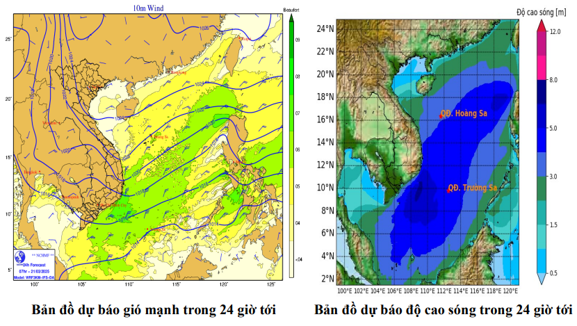 | Thời điểm dự báo | Vùng biển ảnh hưởng | Gió mạnh | Độ cao sóng | ||