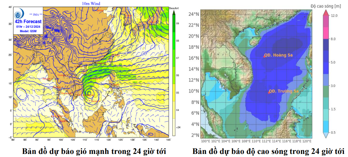 | Thời điểm dự báo | Vùng biển ảnh hưởng | Gió mạnh | Độ cao sóng | ||