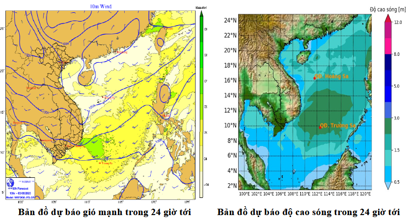 | Thời điểm dự báo | Vùng biển ảnh hưởng | Gió mạnh | Độ cao sóng | ||