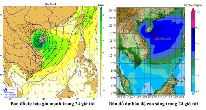 | Thời điểm dự báo | Vùng biển ảnh hưởng | Gió mạnh | Độ cao sóng | ||