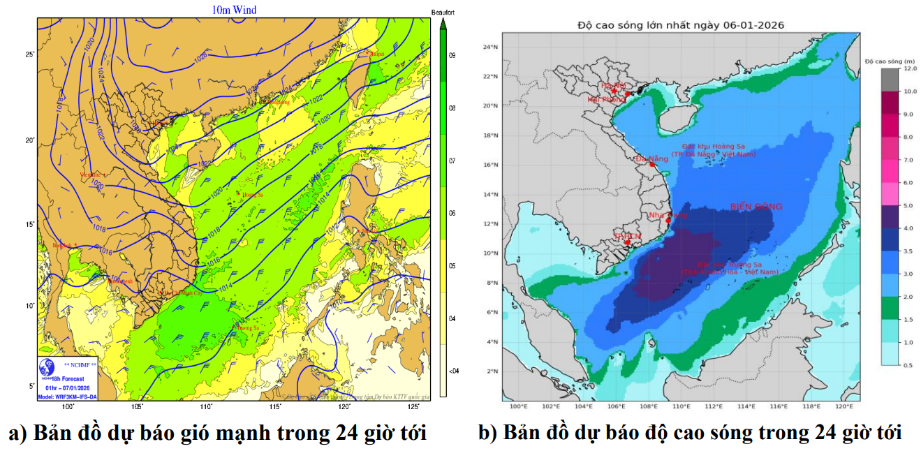 Cảnh báo: Đêm 07 và ngày 08/01, vùng biển Gia Lai có gió Đông Bắc mạnh cấp 6, giật cấp 7-8. Biển động. Sóng biển cao 2,0-4,0m.