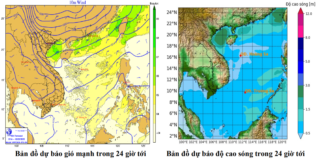 | Đêm 15 và ngày 16/3 | Vùng biển ven bờ | Cấp 5, có lúc cấp 6. Biển động nhẹ | Đông Bắc | 2,0-3,0 | Đông Bắc |