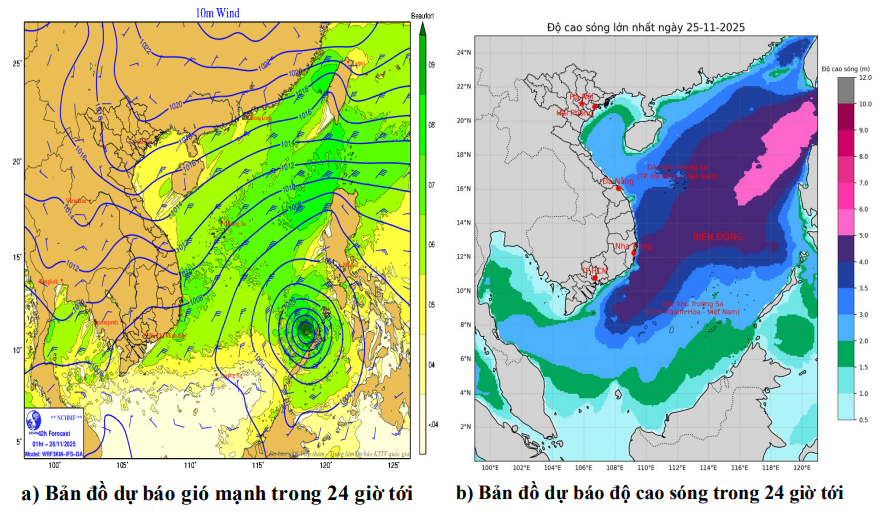 | Đêm 25 và ngày 26/11 | Vùng biển ven bờ | Cấp 6, có lúc cấp 7, giật cấp 8. Biển động mạnh. |