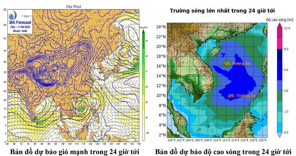 | đêm 11/6 | Vùng biển ngoài khơi | Cấp 6, giật cấp 7-8. Biển động | Tây Nam | 2,0-4,0 | Tây Nam |