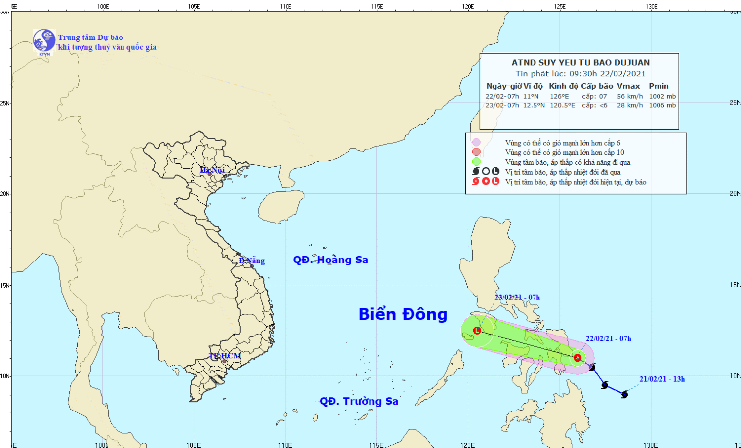 Sáng nay (22/2), bão Dujuan đang hoạt động ở vùng biển phía Đông Nam Phi-líp-pin đã suy yếu thành áp thấp nhiệt đới.