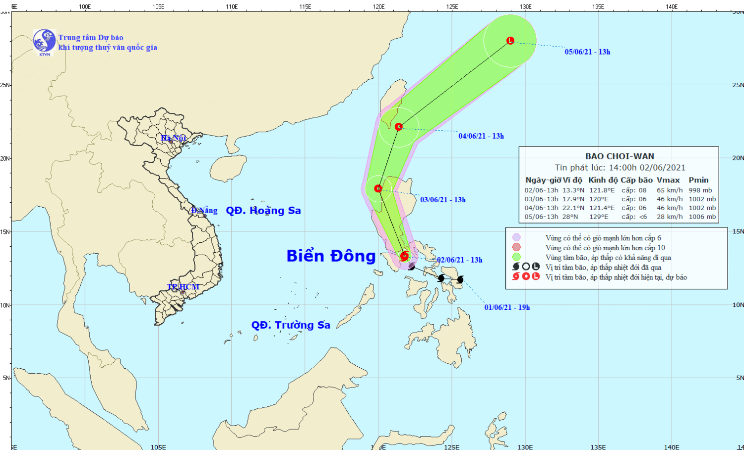 Hồi 13 giờ ngày 02/6, vị trí tâm bão ở vào khoảng 13,3 độ Vĩ Bắc; 121,8 độ Kinh Đông, trên khu vực miền Trung Phi-líp-pin. Sức gió mạnh nhất vùng gần tâm bão mạnh cấp 8 (60-75km/giờ), giật cấp 10.
