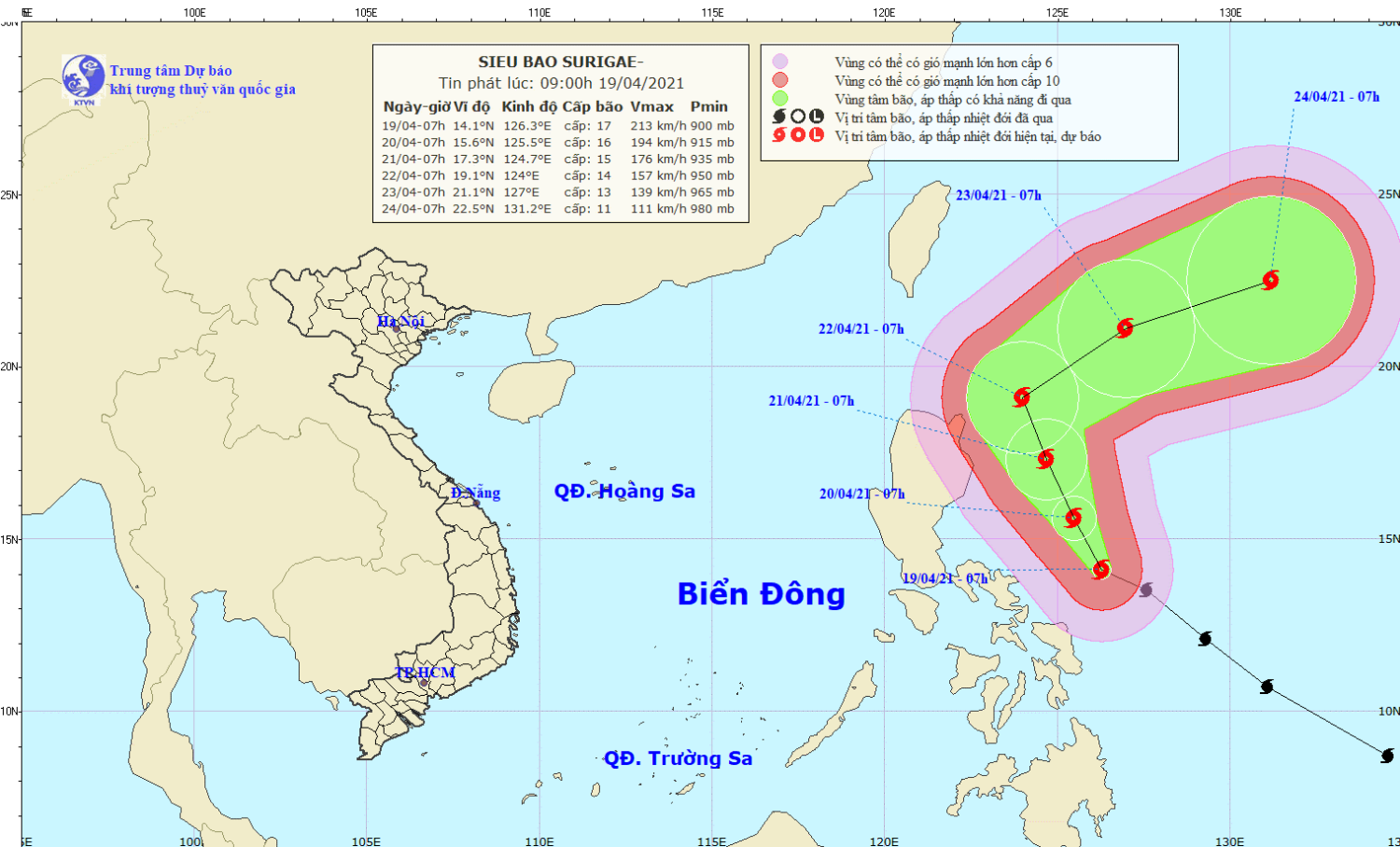 Dự báo trong 24 giờ tới, bão di chuyển theo hướng Tây Bắc, mỗi giờ đi được khoảng 10km. Đến 07 giờ ngày 21/4, vị trí tâm bão ở khoảng 17,1 độ Vĩ Bắc; 124,5 độ Kinh Đông, cách đảo Lu-dông (Phi-líp-pin) khoảng 210km về phía Đông. Sức gió mạnh nhất vùng gần tâm bão mạnh cấp 15 (165-185km/giờ), giật trên cấp 17.