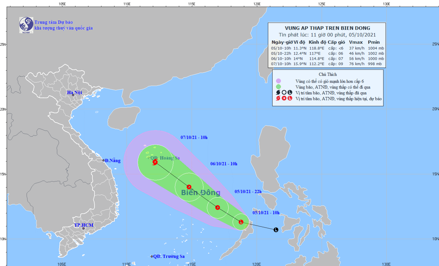 Dự báo trong 12 đến 24 giờ tiếp theo, áp thấp nhiệt đới di chuyển chủ yếu theo hướng Tây Bắc, mỗi giờ đi được 20-25km và có khả năng mạnh thêm. Đến 10 giờ ngày 06/10, vị trí tâm áp thấp nhiệt đới ở khoảng 14,0 độ Vĩ Bắc; 114,8 độ Kinh Đông, cách quần đảo Hoàng Sa khoảng 400km về phía Đông Nam. Sức gió mạnh nhất vùng gần tâm áp thấp nhiệt đới mạnh cấp 7 (50-60km/giờ), giật cấp 9.
