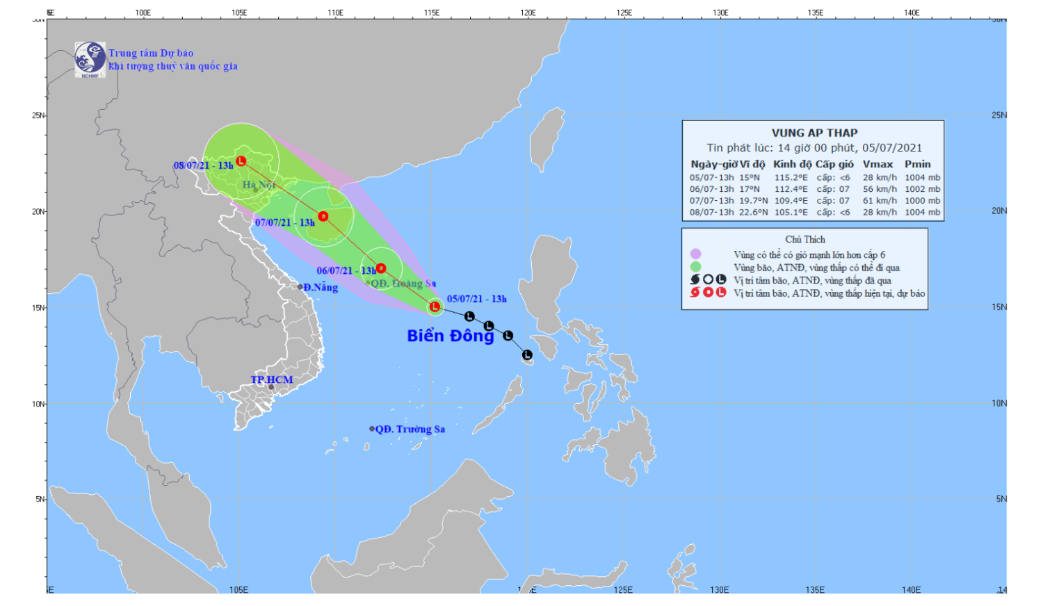 Hồi 13h giờ ngày 05/7, vị trí trung tâm vùng áp thấp ở vào khoảng 14,5-15,5 độ Vĩ Bắc; 114,7-115,7 độ Kinh Đông, cách quần đảo Hoàng Sa khoảng 350km về phía Đông Nam.