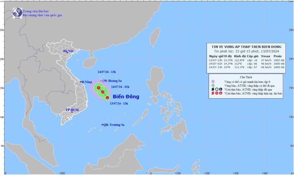 Hồi 13 giờ, vị trí trung tâm vùng áp thấp ở vào khoảng 13,3 độ Vĩ Bắc; 112,8 độ Kinh Đông. Sức gió mạnh nhất ở trung tâm vùng áp thấp mạnh cấp 5,