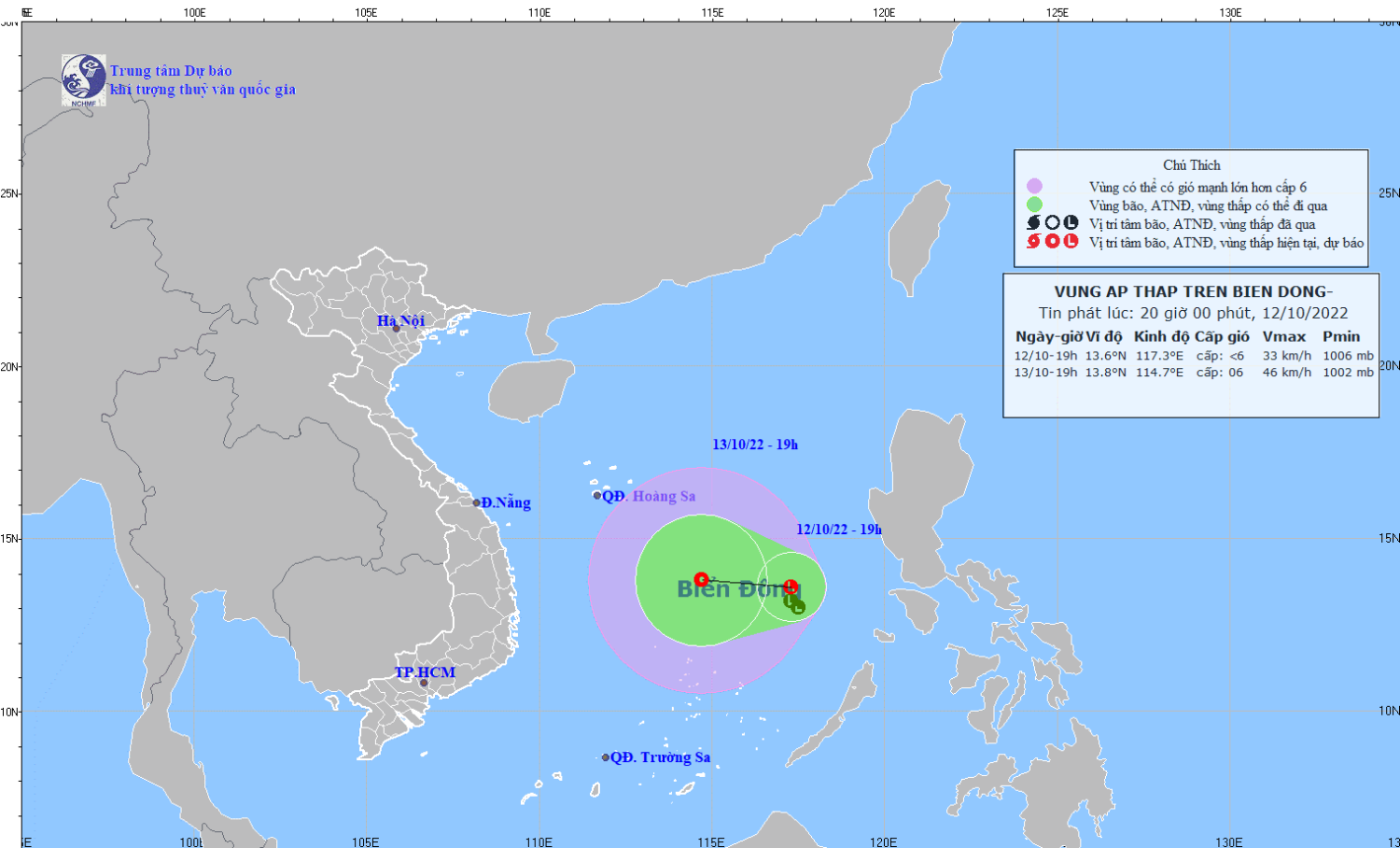 Dự báo trong 24 giờ tới, vùng áp thấp di chuyển theo hướng Tây, mỗi giờ đi được khoảng 10km và có khả năng mạnh lên thành áp thấp nhiệt đới. Đến 19 giờ ngày 13/10, vị trí tâm áp thấp nhiệt đới ở khoảng 13,8 độ Vĩ Bắc; 114,7 độ Kinh Đông, cách đảo Song Tử Tây khoảng 240km về phía Bắc. Sức gió mạnh nhất vùng gần tâm áp thấp nhiệt đới mạnh cấp 6-7 (39-61km/giờ), giật cấp 9.