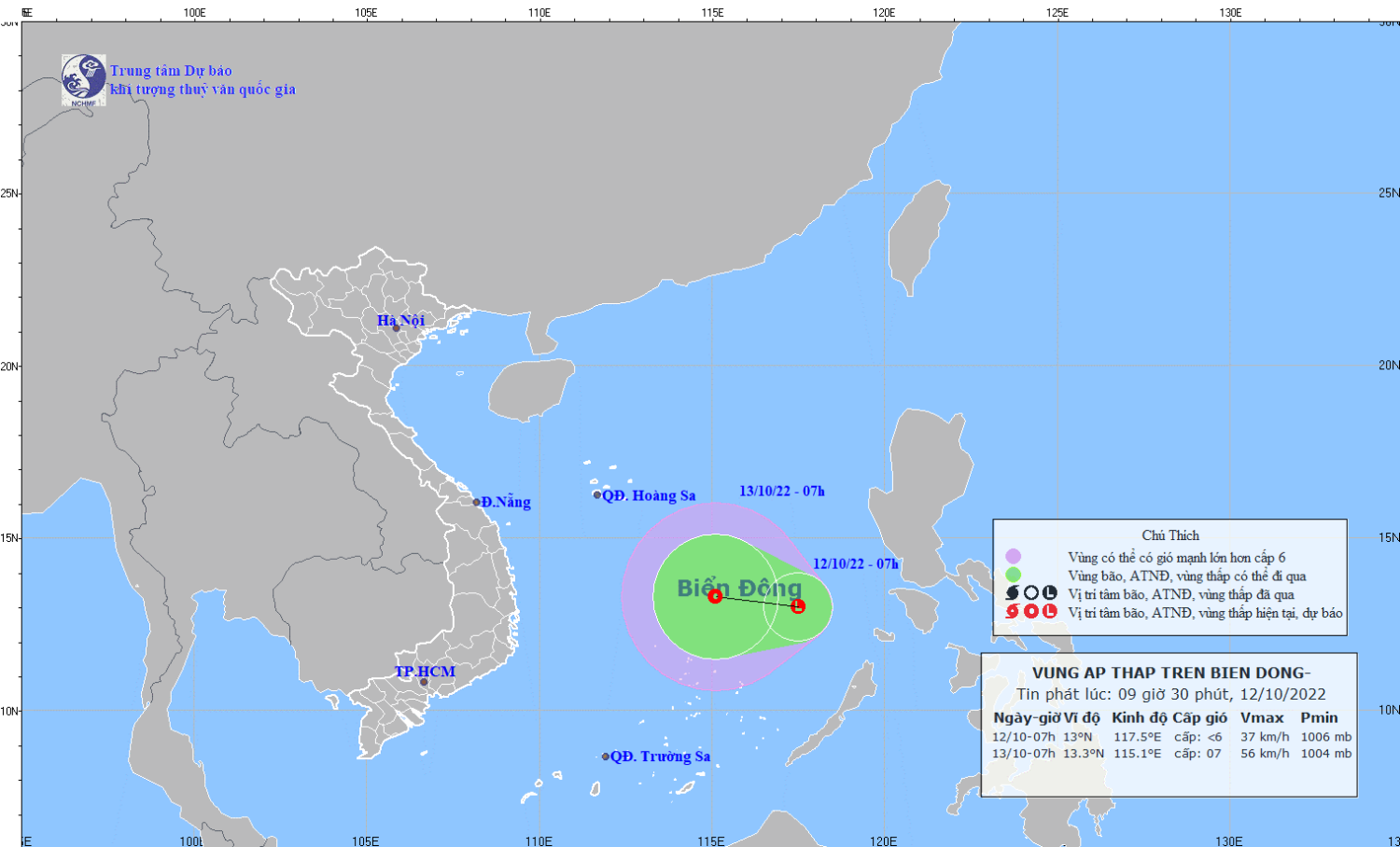 Dự báo trong 24 giờ tới, vùng áp thấp di chuyển theo hướng Tây, mỗi giờ đi được khoảng 10km và có khả năng mạnh lên thành áp thấp nhiệt đới. Đến 07 giờ ngày 13/10, vị trí tâm áp thấp nhiệt đới ở khoảng 13,3 độ Vĩ Bắc; 115,1 độ Kinh Đông, cách đảo Song Tử Tây khoảng 200km về phía Bắc Đông Bắc. Sức gió mạnh nhất vùng gần tâm áp thấp nhiệt đới mạnh cấp 6-7 (39-61km/giờ), giật cấp 9.