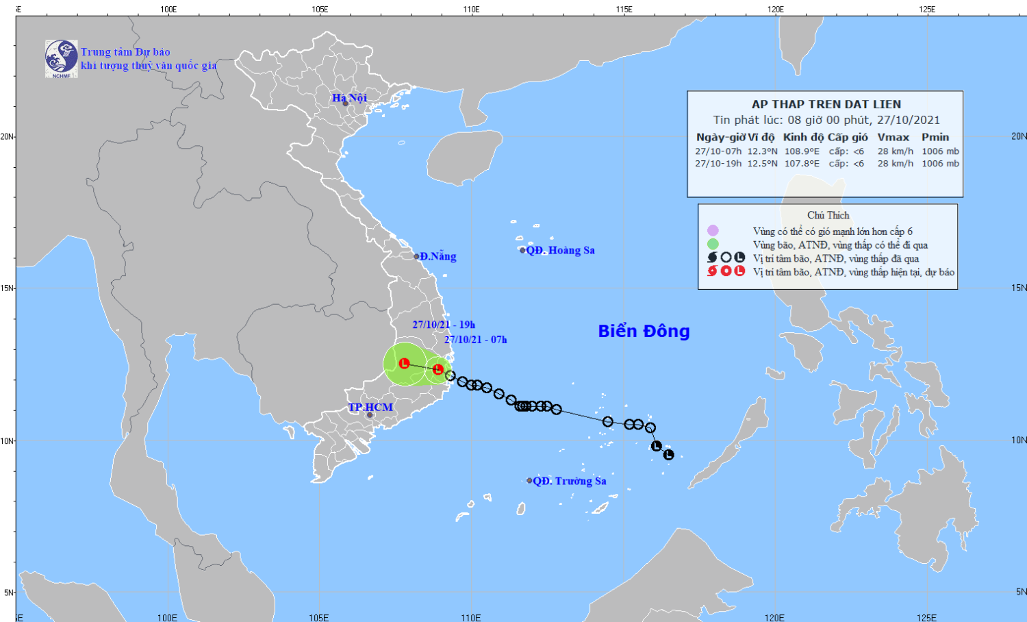 Hồi 07 giờ ngày 27/10, vị trí trung tâm vùng áp thấp ở ngay trên đất liền tỉnh Khánh Hòa. Sức gió mạnh nhất ở trung tâm vùng áp thấp giảm xuống dưới cấp 6 (dưới 40km/giờ).