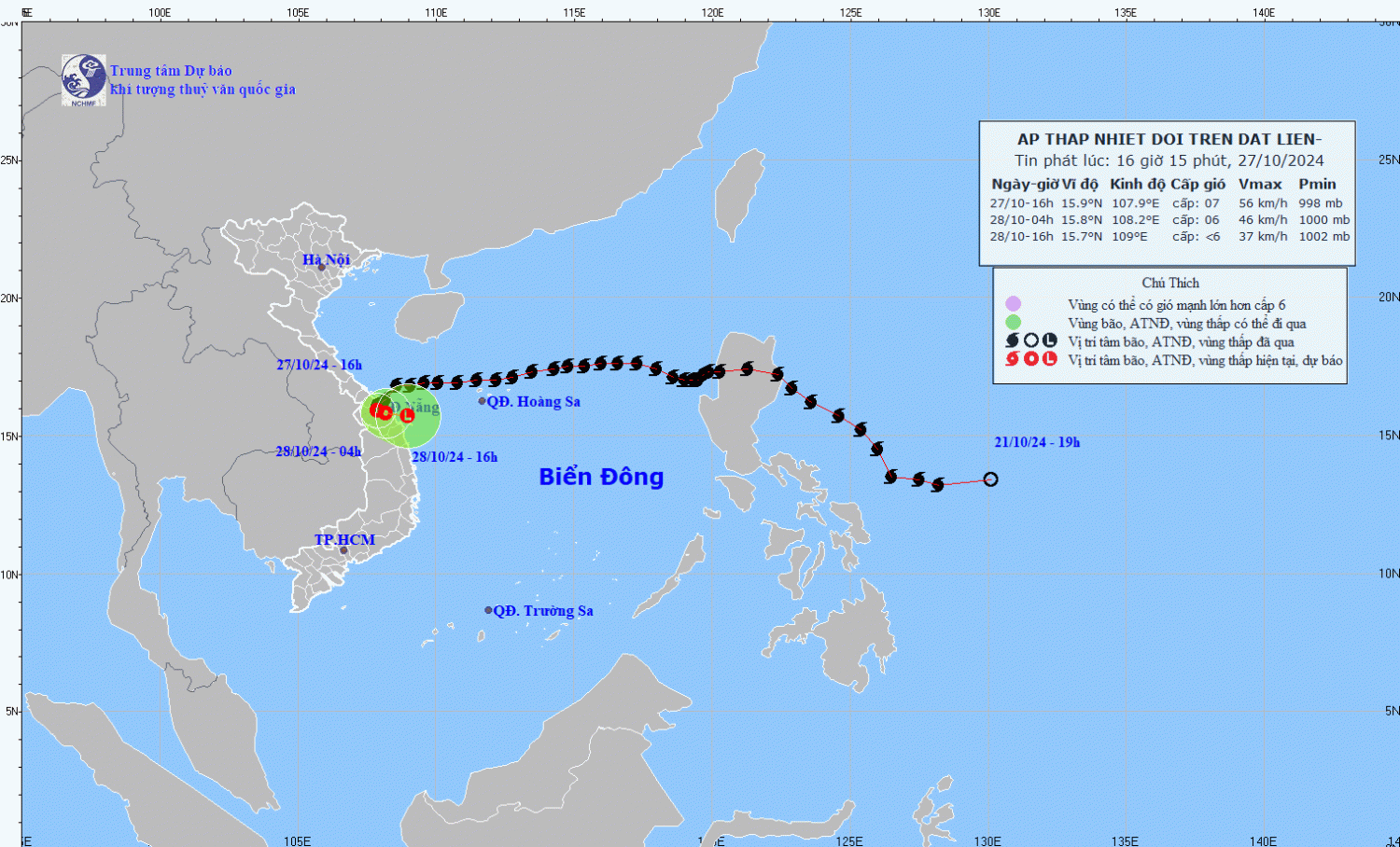 | 04h/28/10 | Đông Nam 3-5km/h | 15,8N-108,2E; trên đất liền Thừa Thiên Huế, Quảng Nam-Đà Nẵng | Cấp 6, giật cấp 8 | Vĩ tuyến 15,0N-18,0N; phía Tây Kinh tuyến 110,0E | Cấp 3: vùng biển Trung Trung Bộ; đất liền ven biển khu vực Quảng Trị-Quảng Nam |